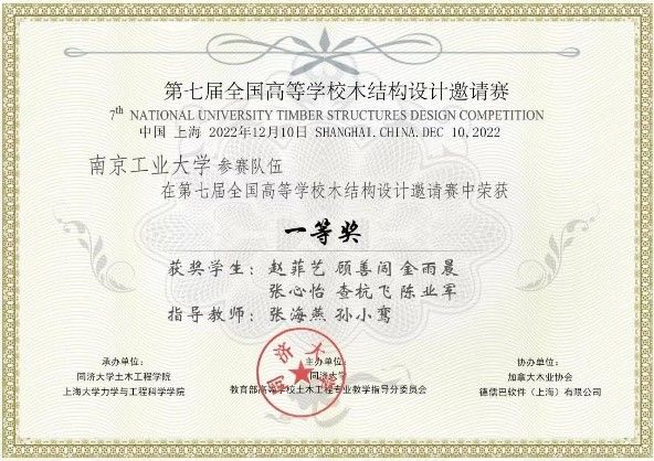 2022年12月10日,第七届“全国高等学校木结构设计邀请赛”决赛成绩揭晓。我院学生金雨晨、赵菲艺、张心怡、顾善闯与土木工程学院陈业军、查杭飞的作品(指导老师:张海燕、孙小鸾)以第一名的成绩获一等奖。