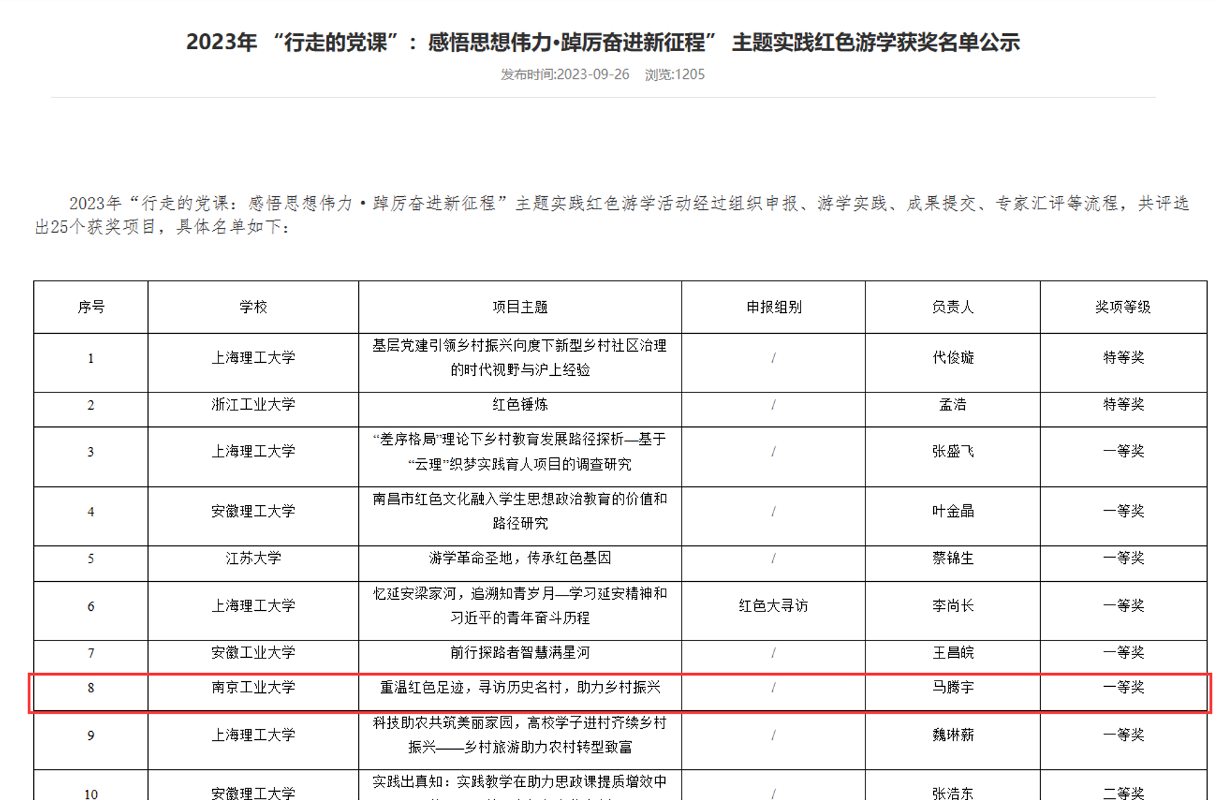 近日,2023年 “行走的党课:感悟思想伟力·踔厉奋进新征程”主题实践红色游学活动获奖名单公布,我院主题为《重温红色足迹,寻访历史名村,助力乡村振兴》的项目获一等奖。