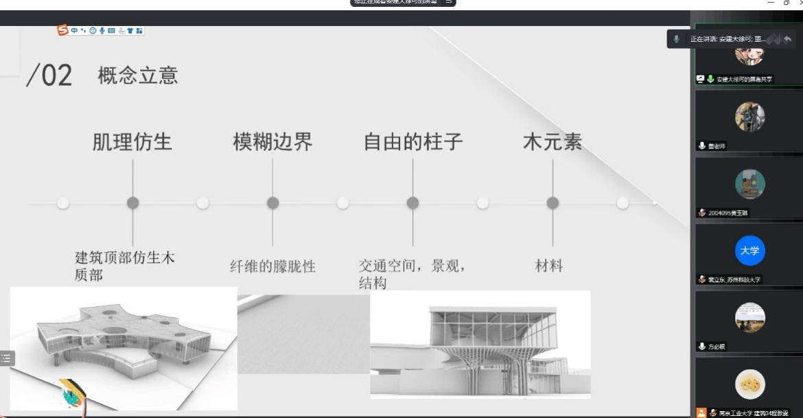 因疫情不断,考虑到各校的出行安全,最终在两个月后于10月15日在线上进行了中期联合答辩。每个学校选取了8份作业,分成了5个小组同时开展答辩,答辩过程不同学校的老师对各组同学现阶段的成果进行了详尽的点评,现场气氛和谐、热烈。通过这次线上答辩,不仅各校同学之前相互学习,收获丰富,老师之间也进行了教学各方面的交流和学习,促进了各校之间的教学方法的互通互融,大家都深受启发。这次中期答辩不仅为同学们继续完善和深化设计提供了重要指导作用,也体现了五校建筑专业在新时代与时俱进的探索、合作精神。